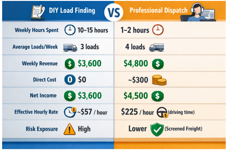 You saved $300 on dispatch fees this week, which seems like a smart way for an owner-operator to save money. But what if that “savings” cost you $1,200 in lost income because you spent 15 hours looking for loads instead of driving?