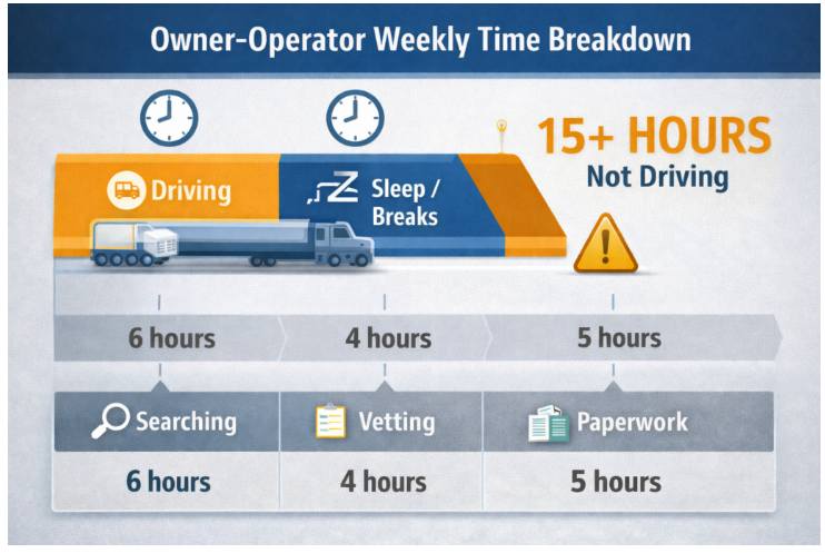 For most owner-operators who do spot freight, it doesn’t take five minutes to find a single load. It usually takes two to three hours to lock in a load because you have to scan load boards, check out brokers, negotiate rates, and confirm details. If you add three to four loads a week, that’s nine to twelve hours gone before the truck even moves.